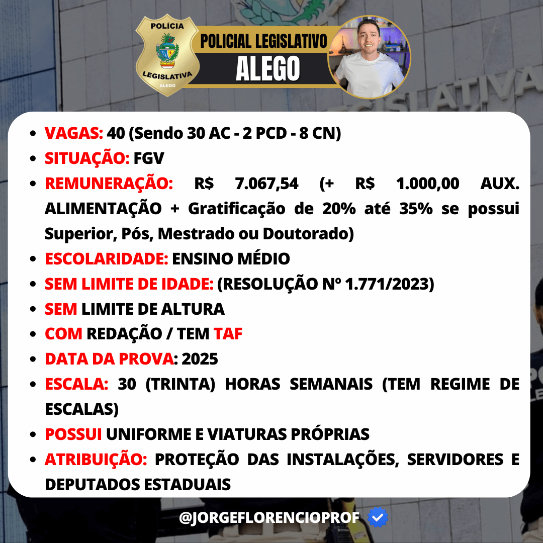 A presença de Redação e Teste de Aptidão Física (TAF) reforça o perfil técnico e operacional do cargo. 6. Estrutura de Trabalho: A instituição oferece uniforme e viaturas próprias, indicando um órgão estruturado e com os meios necessários para a execução das atribuições do cargo, que incluem a proteção das instalações, servidores e deputados estaduais.
